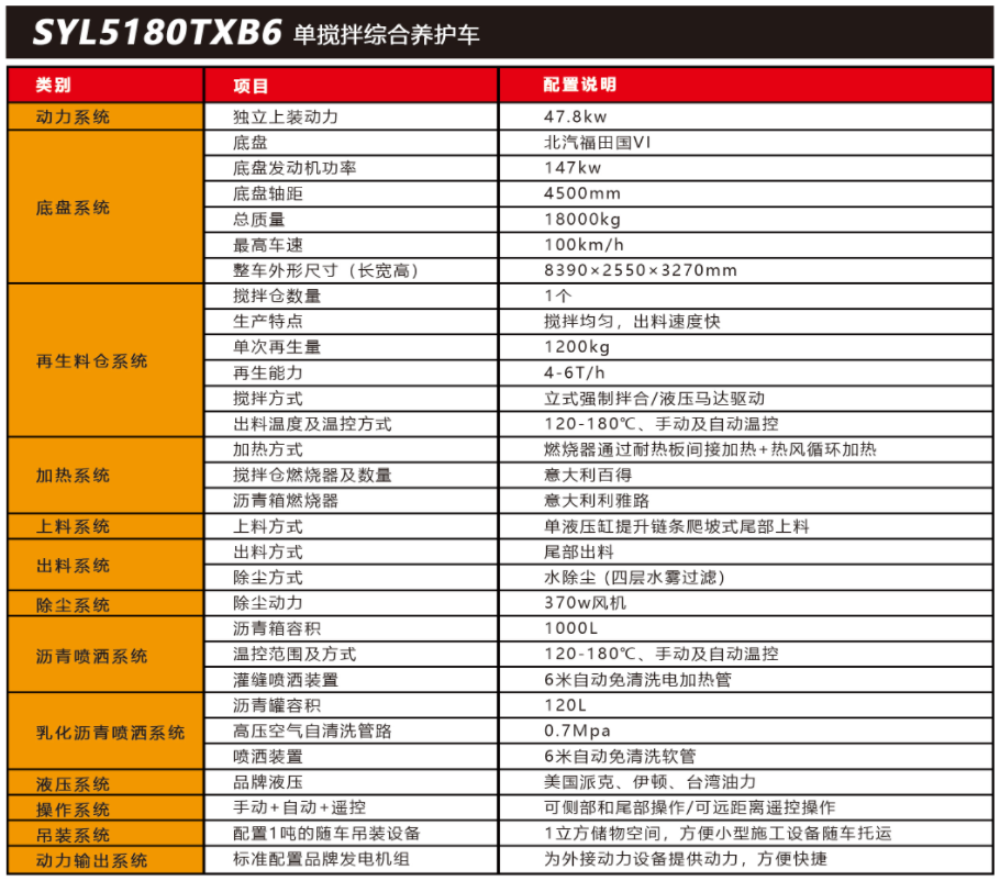 SYL5180TXB6 單攪拌綜合養(yǎng)護車是一款集現(xiàn)場生產(chǎn)新瀝青混合料、瀝青路面冷料、 舊料、銑刨料 100%現(xiàn)場加熱再生利用 ,熱瀝青灑布、裂紋跟蹤灌縫、乳化瀝青噴灑、為 其他裝置提供電力和液壓動力等多種功能于一體的瀝青路面熱再生綜合養(yǎng)護車??蓪崿F(xiàn)多 場合、多路面的各種類養(yǎng)護作業(yè) ,養(yǎng)護修補費用低 ,作業(yè)快捷 ,高效率、節(jié)能環(huán)保性能突 出等特點。適用于遠郊較寬闊區(qū)域中小施工量和高速公路的修補施工。