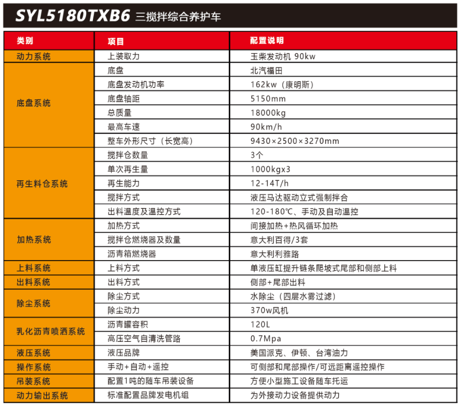 SYL5180TXB6 三攪拌路面綜合養(yǎng)護(hù)車是一款集現(xiàn)場(chǎng)生產(chǎn)新瀝青混合料、瀝青路面冷 料、舊料、銑刨料 100%現(xiàn)場(chǎng)加熱再生利用,熱瀝青灑布、裂紋跟蹤灌縫、乳化瀝青噴灑、 為其他裝置提供電力和液壓動(dòng)力等多種功能于一體的瀝青路面熱再生綜合養(yǎng)護(hù)車??蓪?shí)現(xiàn)多場(chǎng)合、多路面的各種類養(yǎng)護(hù)作業(yè)。養(yǎng)護(hù)修補(bǔ)費(fèi)用低 ,作業(yè)快捷 ,高效率、節(jié)能環(huán)保性能